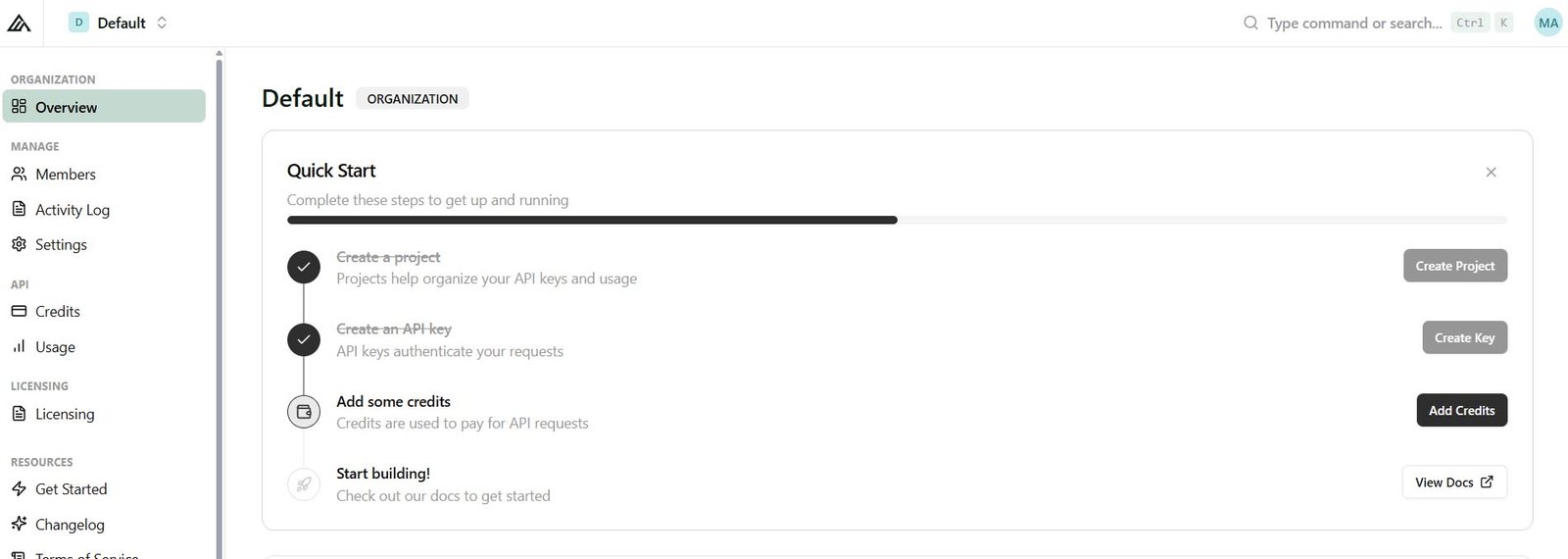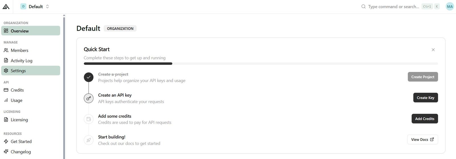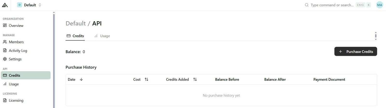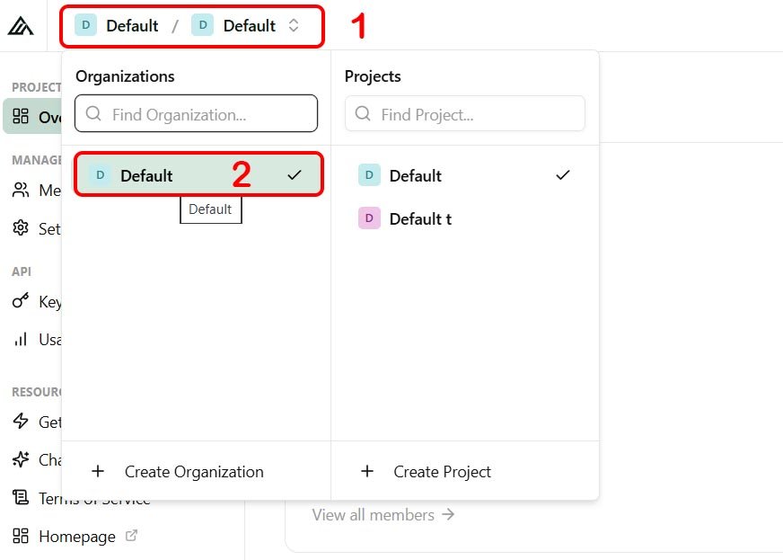 Go to the default ‘Organization’ by clicking on the top left on Default / Default :